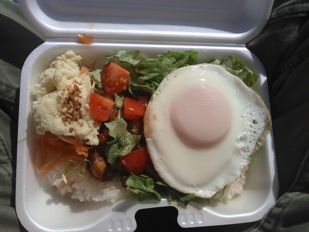 ご飯の上に、たっぷりのレタスとソースをからめたチキン(だったと思います)、トマトが乗っていて、脇にマッシュポテトがのっていました。